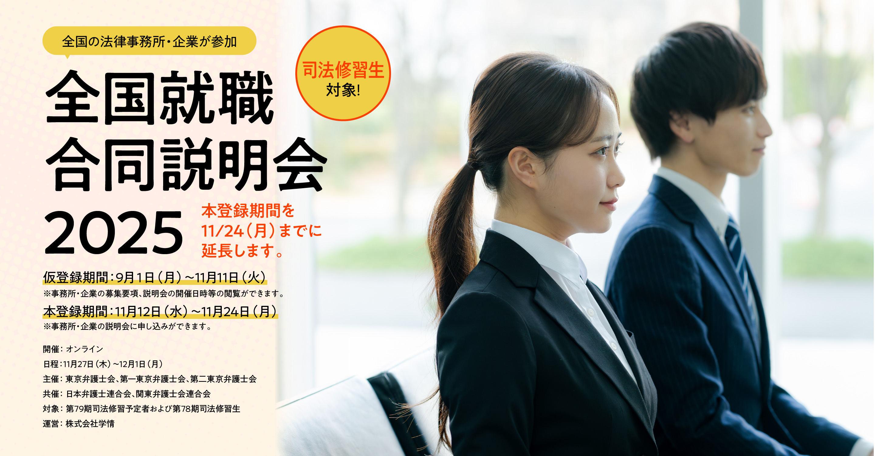 日弁連の主催により、就職活動の一般的な流れや履歴書の作成、面接等における注意点をレクチャーするとともに、若手弁護士が経験談やアドバイスを語るパネルディスカッションや、各ブースでの質問コーナー・事前予約制の個別相談会を実施する「就職活動セミナー」(Zoom併用)が開催されます。詳細は日弁連ウェブサイトにてご確認ください。